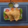 A gold savory pastry stuffed with mixed vegetables and spices.